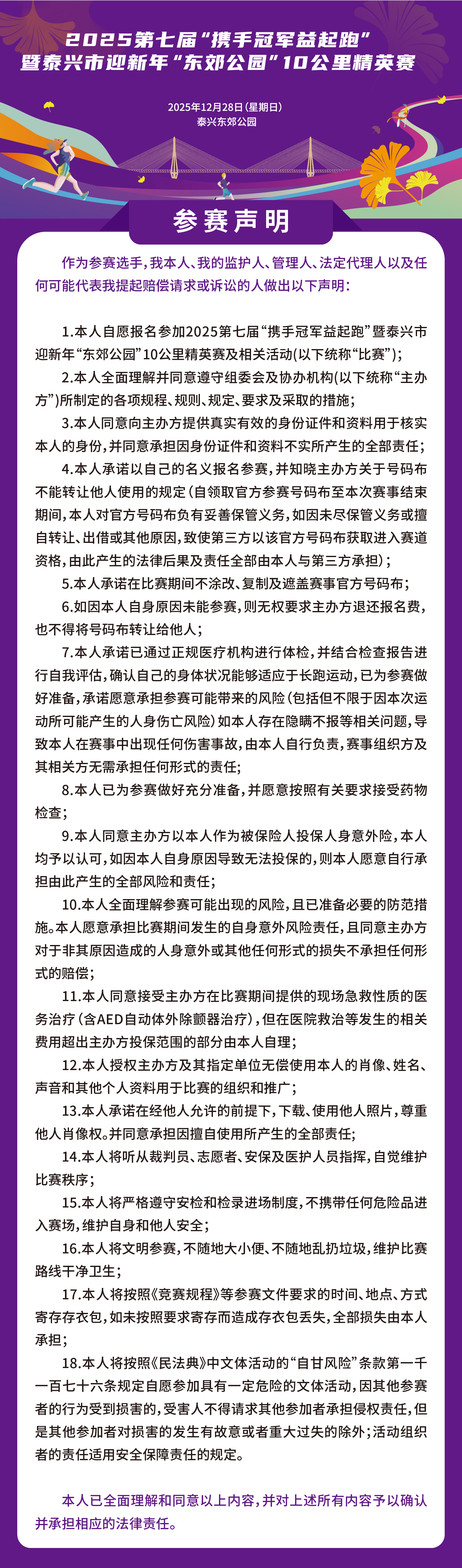 泰兴市迎新年“东郊公园”10公里精英赛参赛声明